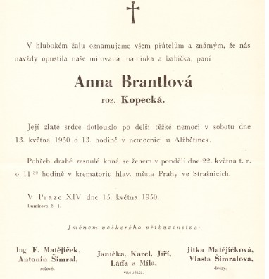 Musím bohužel konstatovat, že se mi dosud nepodařilo zjistit, kdy a kde pradědeček Ladislav Brantl zemřel, ale v době sňatku naší babičky Jitky v roce 1948 již nežil (v prosinci 1941 ještě žil – jeuveden u sňatku dcery Vlasty coby penzista v Nuslích v Lumírově ulici 8). Prostřednictvím kolegů z Archivu hlavního města Prahy jseminformován, že v Praze nezemřel, respektive v Praze jeho úmrtí nebylo nalezeno. Jeho ovdovělá žena Anna Brantlová rozená Kopecká zemřela 13. května 1950 v nemocnici sv. Alžběty Na Slupi po dlouhé těžké nemoci, tedy tři dny po narození své vnučky Jany Matějíčkové, mojí matky. Podle protektorátní občanské legitimace Anny Brantlové víme, že rodina nejpozději od roku 1939 bydlela na Vyšehradě v Lumírově ulici, kde nedaleko odtud bydlel i náš děda František Matějíček. Podobenka Anny Brantlové na této legitimaci je jedinou fotografií z naší pozůstalosti praprarodičů Brantlových – bohužel nedochovala se nám jediná podobenka pradědy Ladislava.